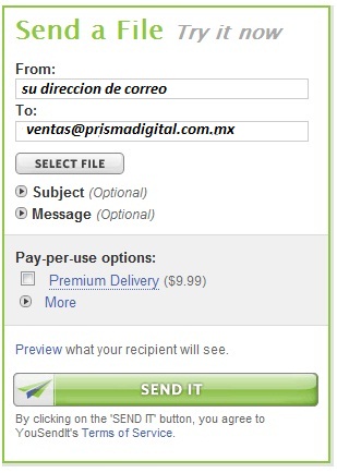 El envío de archivos pequeños de menos de 3mb se puede hacer como archivo adjunto a nuestra dirección electrónica. ventas@prismadigital.com.mx